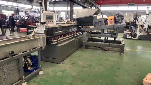 造粒工藝:500/1000升高低混機------大型螺旋上料機------雙螺桿喂料機-----JDL-75D雙螺桿擠出機---—-液壓板式換網(wǎng)——-拉條機頭------30米不銹鋼輸送帶------龍門切粒機------2.5米加長振動篩-----風冷產(chǎn)品料倉-------主機采用:PLC控制